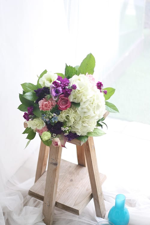 사진에 보시는 플로라꽃다발은 화이트 수국에 보라색 스토크/리시안셔스를